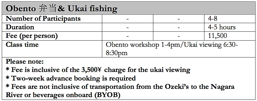Make specialty ayu (sweetfish) obento during an afternoon workshop and enjoy it that same evening onboard an authentic handmade wooden boat waiting for the sun to set.
