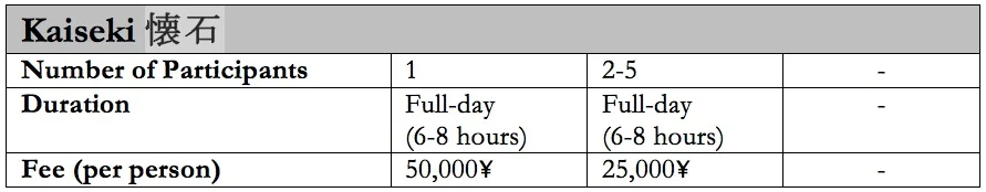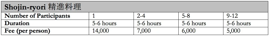 Please understand that fees are subject to a 10-15% variance due to fluctuating food costs. Chef Shuji will notify participants of the actual price at the time of inquiry and booking.